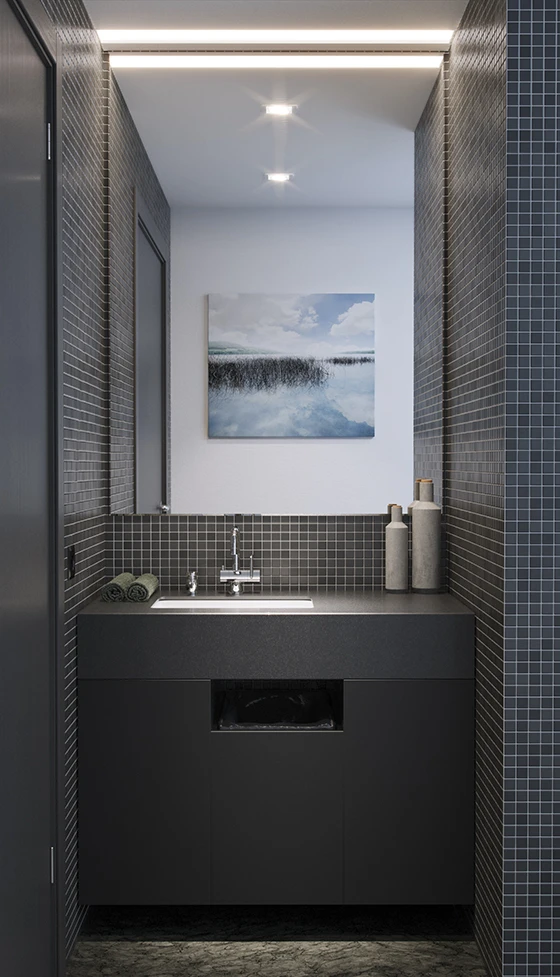 Every washbasin-housing, which fits perfectly into a differently sized niche, as well as every ultra-slim mirror, were made to measure. The former – in black laminate, complementing the dark, grid-like, mosaic-tiled walls – features an integrated bin for used paper towels as well as a soap dispenser. Even in this most minimal of spaces, the architectural is articulated to the full. ‘Our practice’s reduced and typological design language – which subscribes to the Miesian aphorism of “less is more” – found expression in talsee’s bathroom furniture, too, meaning the entire project could be seen as a harmonious whole.’